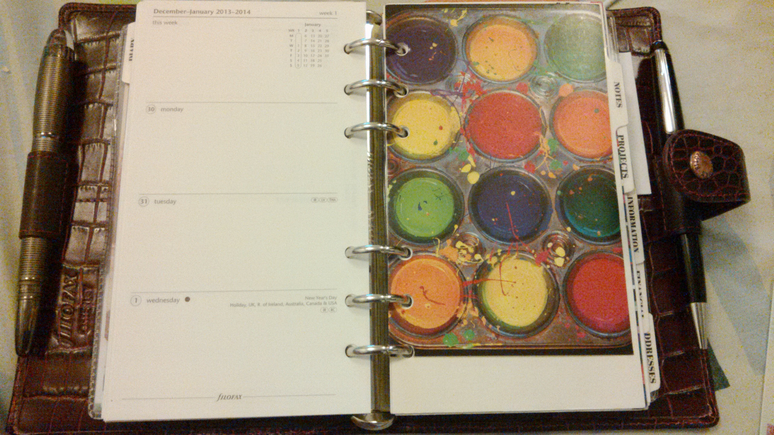 My diary is always a week on two pages (WO2P). I can’t make do with anything else. I used to use a Week + Notes last year, which worked well for me but then decided to change when I got these lovely cotton cream inserts with the Osterley. The paper is definitely of better quality and I love that all the days are the same size with a little notes section on top. I use my diary for my daily To-do lists. Events & meetings are put into my Outlook which syncs with my phone with reminders. I do write down birthdays in red or pink, just to make sure I don’t miss them out. Some important meetings are also put in, just in case. I love putting boxes to check off, but mostly I cross of the whole item when done, only because I feel a particular sense of achievement when I do that!!